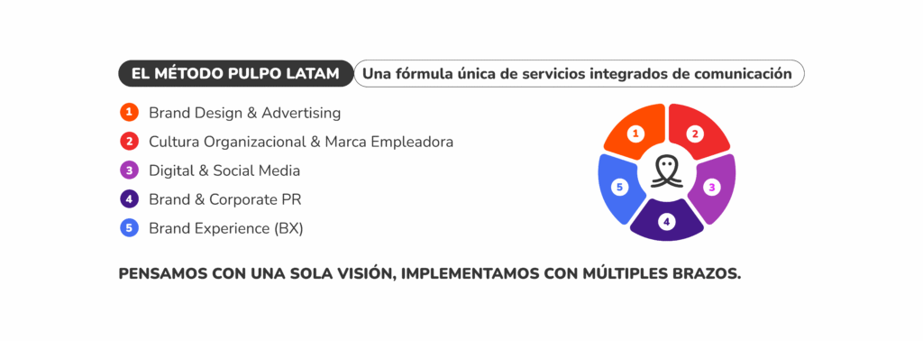 En un mercado donde muchas agencias ofrecen servicios aislados, pulpo latam desarrolló un método propio de comunicación integral para marcas que necesitan coherencia estratégica e implementación real en Latinoamérica.